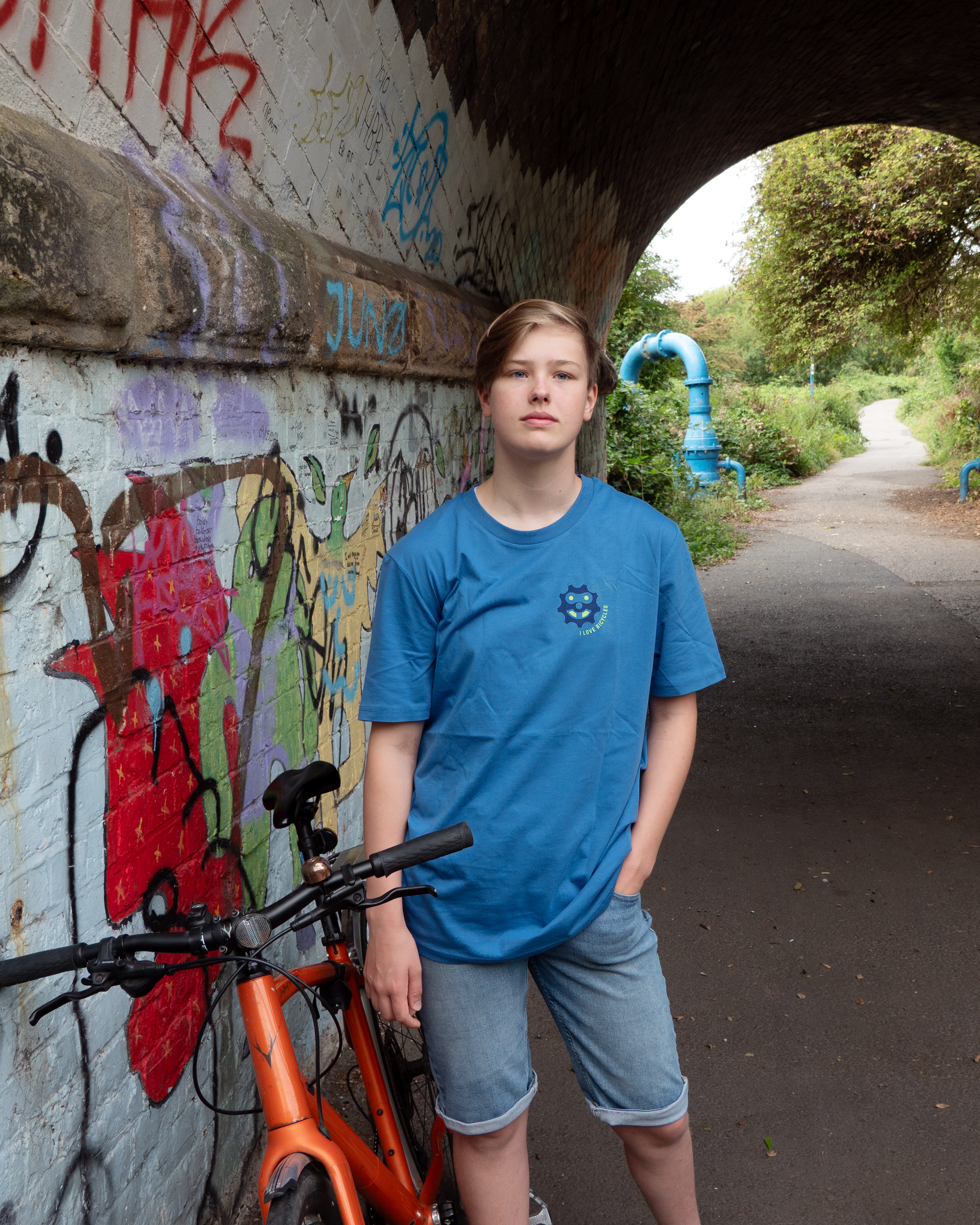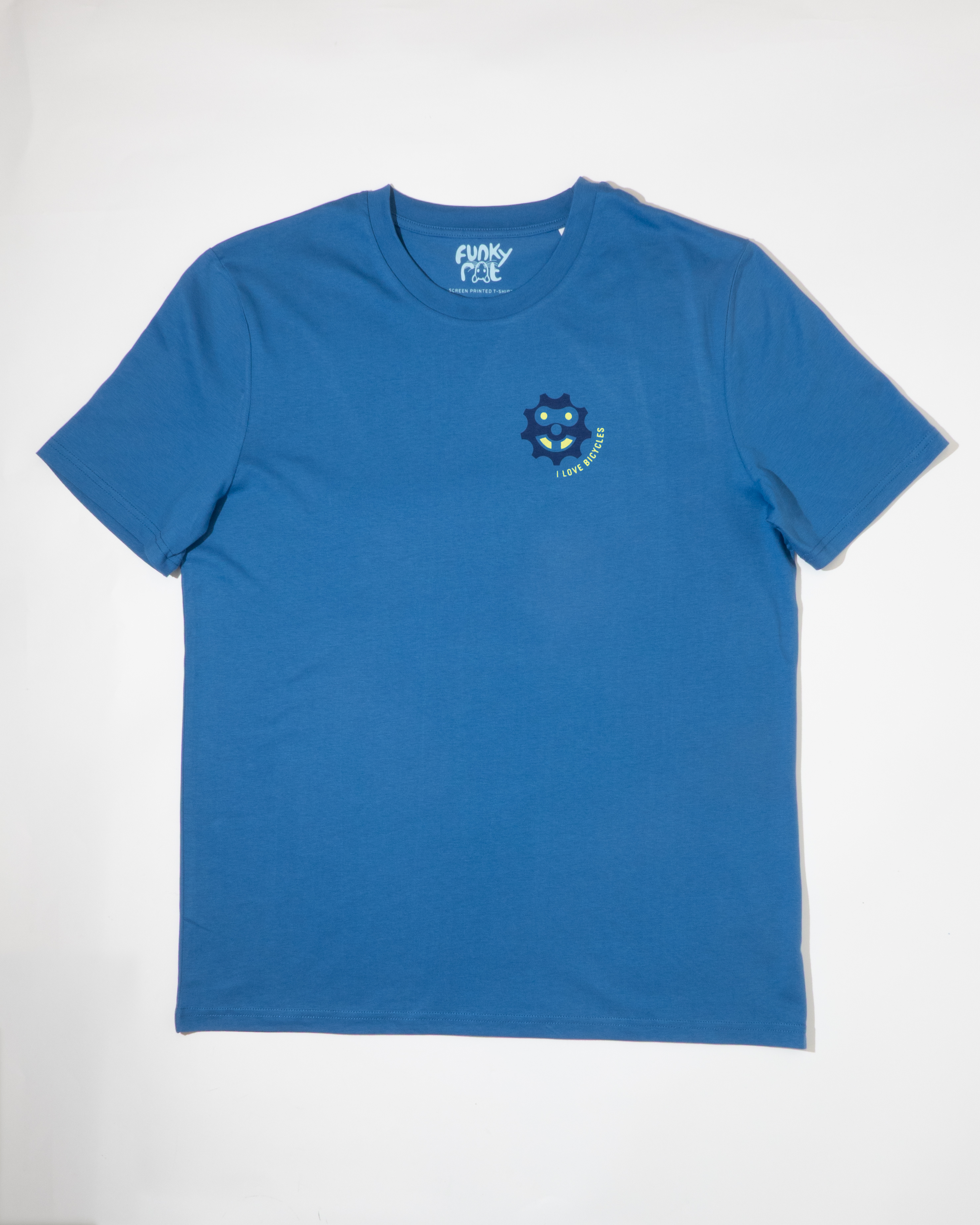 The mid-blue t-shirt is complimented with a two colour print with dark blue and a highlight colour of custard yellow ink.