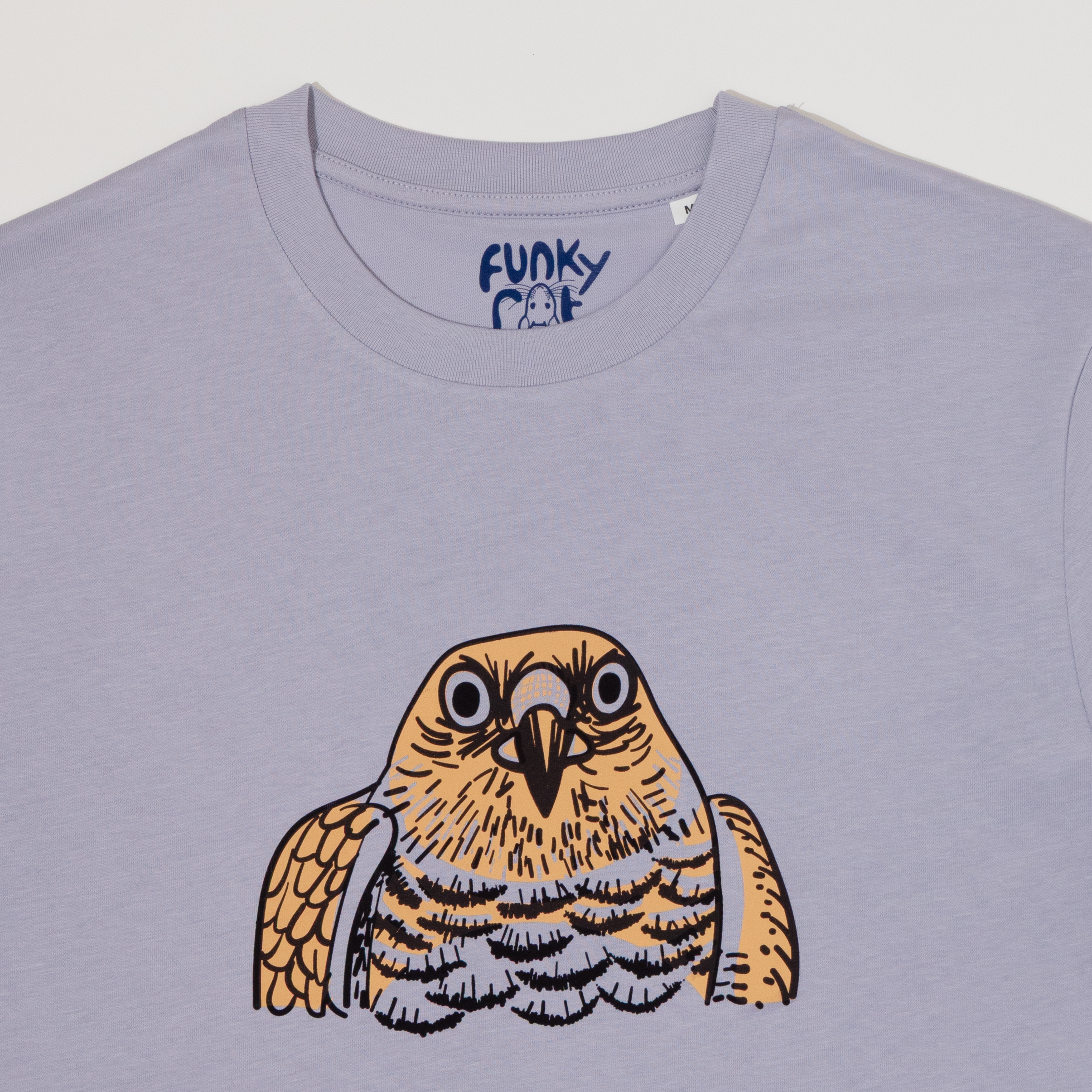 Available in a subtle neutral dust coloured t-shirt is with a two colour print of steely grey blue and a black outline or a vibrant lavender colour t-shirt with a contrasting peachy orange colour print and a black outline.